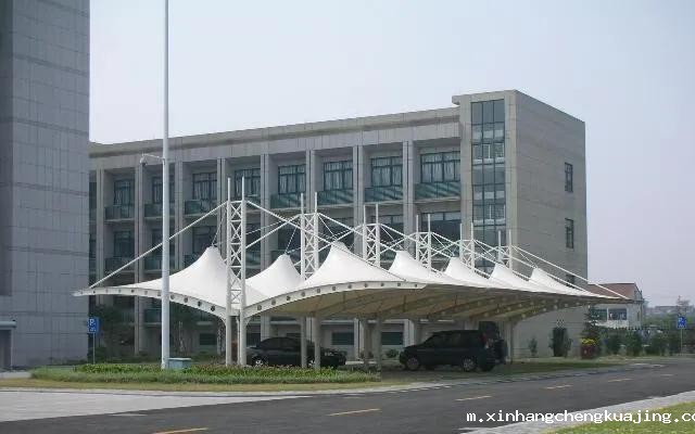 五、膜结构停车棚建成后使用期间的维护保养也是膜结构停车棚能否正常工作的一个重要环节。由于膜材徐变、节点松动等膜面可能因预张力损失而松弛,金属构件外表可能锈蚀,膜面涂层可能局部剥落等。因此在使用过程中的维护保养也至关重要。一般工程竣工2年后宜对膜面施加第二次预张力,对金属构件也应在使用4~5年后重新涂刷面漆。