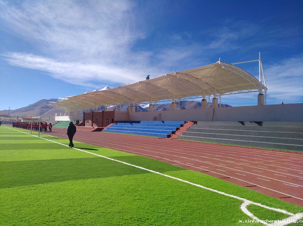 本工程位于西藏自治区,那曲申扎县中学 ,看台天幕采用PVDF膜材 ,结构形式为骨架式结构,采用尖顶排列造型,面积1200平米 ,膜面洁白,整体大气,与高原地貌风景和谐共处,大大提升了体育场档次,是西藏地区一道亮丽的风景!!