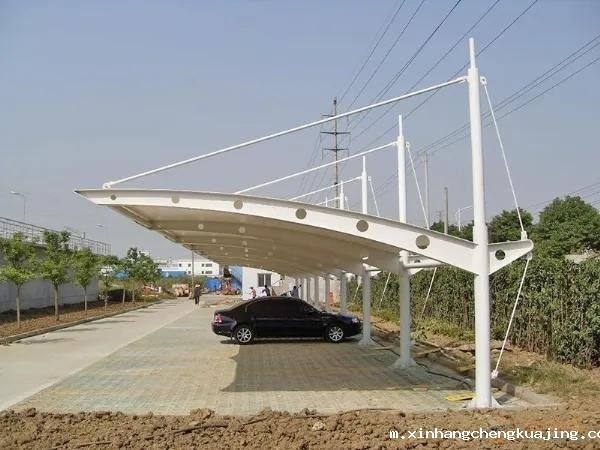 膜结构停车棚是一种建筑与结构完美结合的结构体系;它是用高强度柔性薄膜材料与支撑体系相结合形成具有一定刚度的稳定曲面,能承受一定外荷载的空间结构形式;这种结构形式特别适用于大型体育场馆/入口廊道/小品/公众休闲娱乐广场/展览会场/购物中心/厂区/居民区等领域.