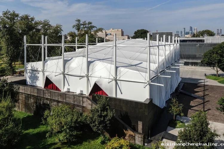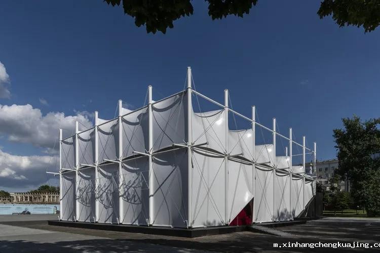 设计师从传统游牧建筑出发, 设想了一种轻便的外部轴承结构,使用PVC膜覆盖架构物外表,呈现出轻巧的建筑体量。在结构轻便与膜片张力的支持下,“游牧”影院可以自由流动