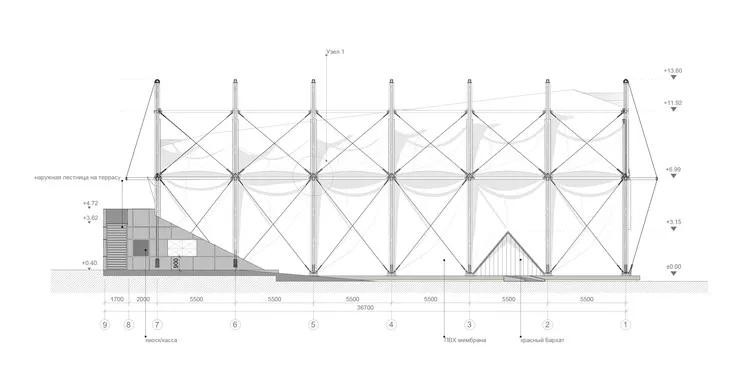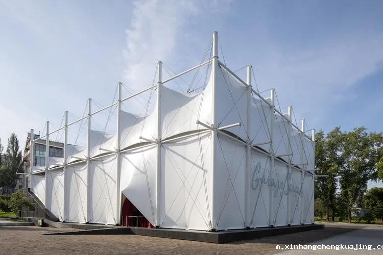 没有结实的墙壁与屏幕作为建设性元素,这款游牧帐篷似的临时影院在第二届车库当代艺术博物馆竞赛中展出,由snkh studio担任设计。