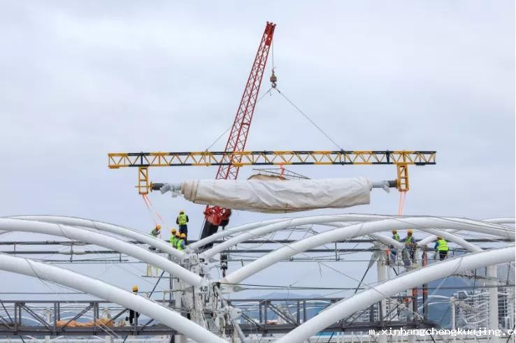 在施工过程中,大家遇到过不少挑战。“膜结构施工除了拼装和焊接外,其余施工全在索结构上部,存在高空作业、无固定点、角度较多等施工难点。”体育场项目生产主管季沅说,膜结构与索结构为整体协同受力,膜面需要穿过钢拱杆上部固定膜接点,无任何工作面,安装难度非常大。